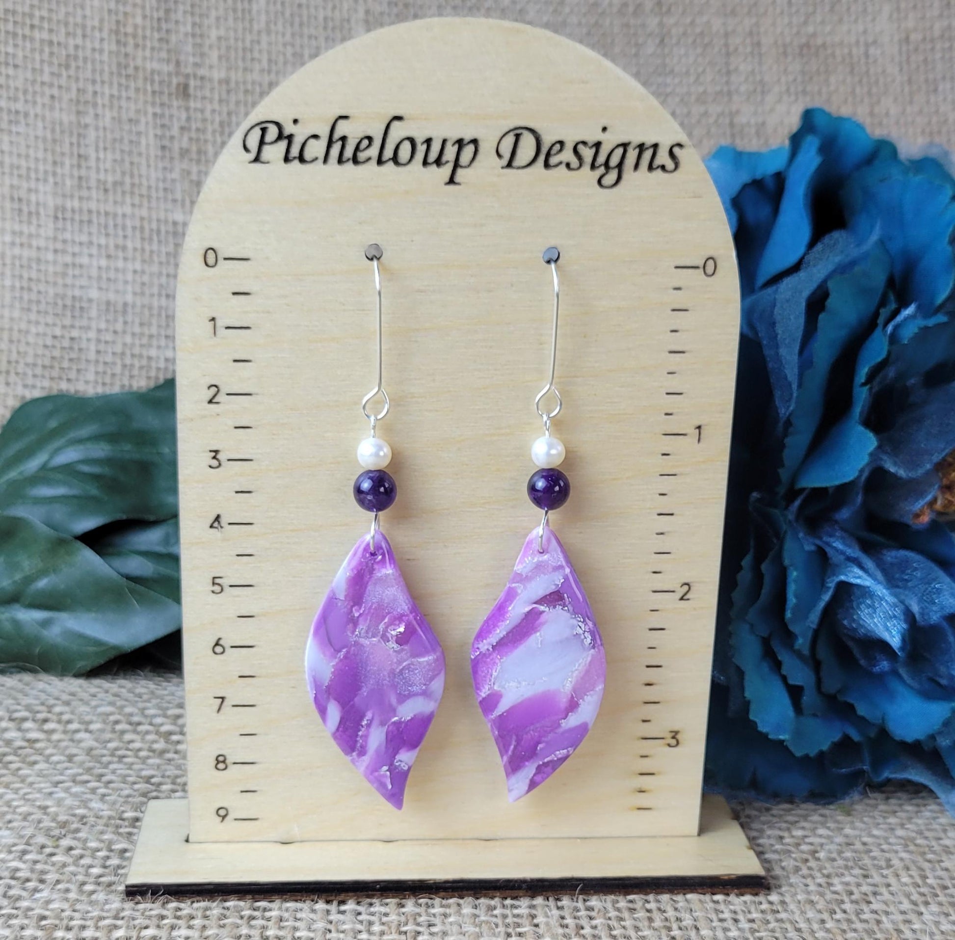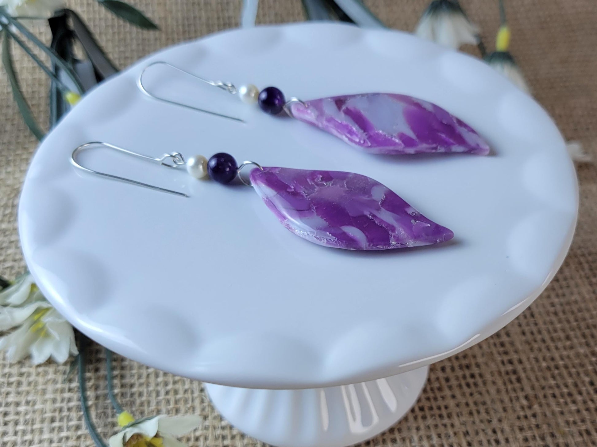 Tap into your inner calm and spiritual clarity with these amethyst-inspired clay earrings. Swirled with rich purples, soft lavender, and hints of silver foil, each pair is carefully handcrafted to reflect the peaceful energy of real amethyst—the stone of intuition and protection. Lightweight and effortless to wear, these earrings are sealed with glossy resin for durability and set on hypoallergenic sterling silver ear wires that are gentle on sensitive skin. Whether you're heading to yoga, meditation, or simply out for coffee, these earrings offer both style and soul. Dimensions, length 3 1/2 inches, width 3/4 inch.