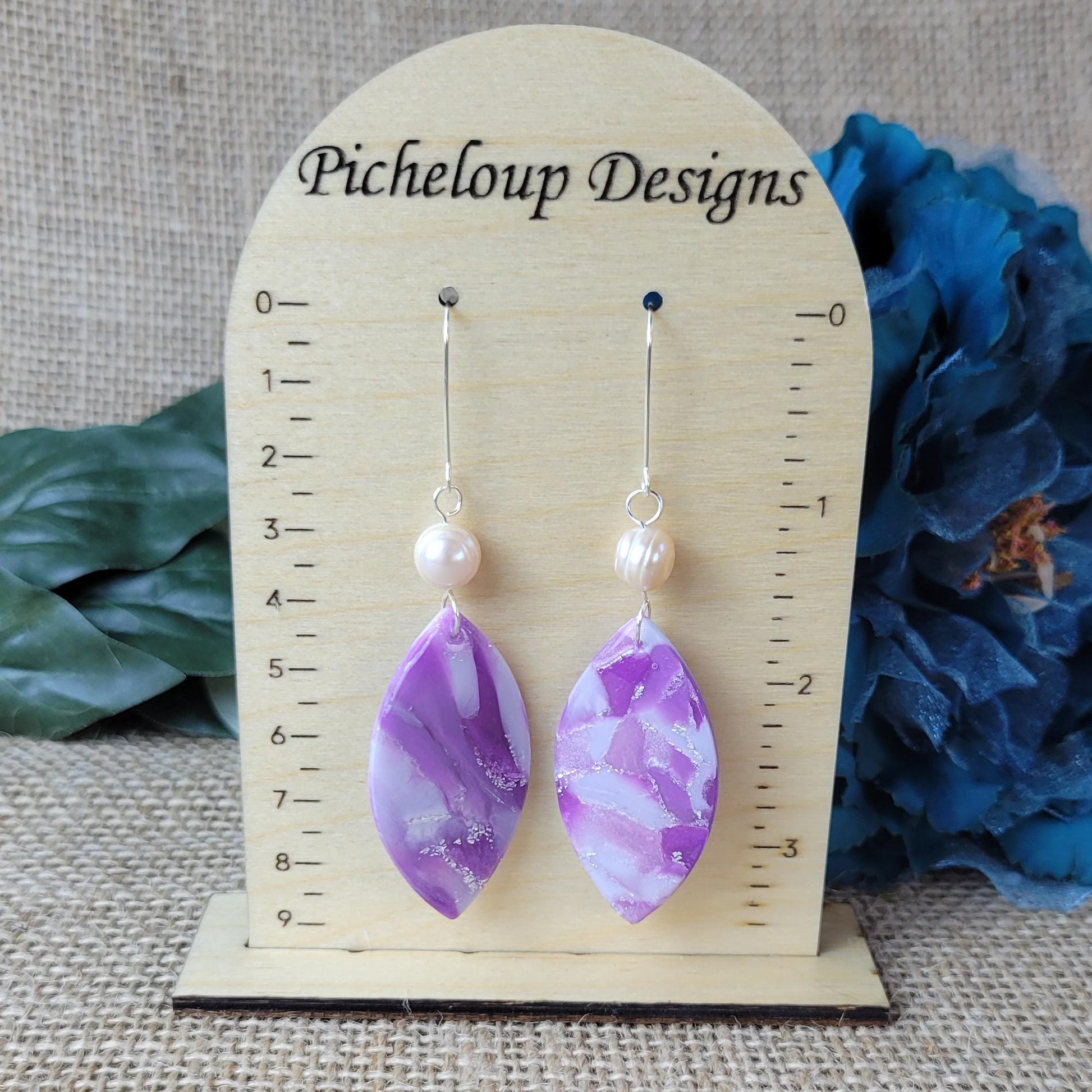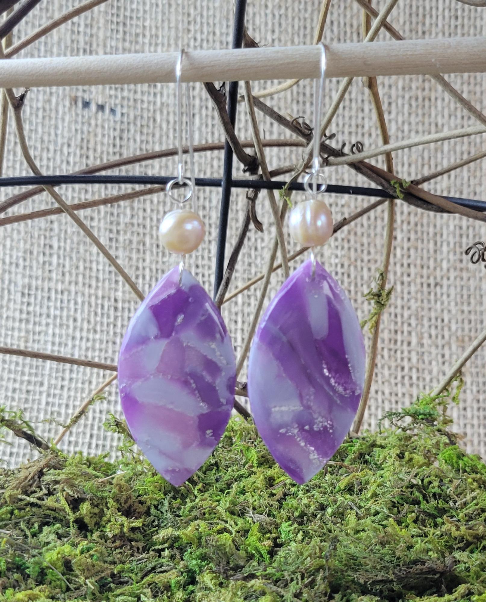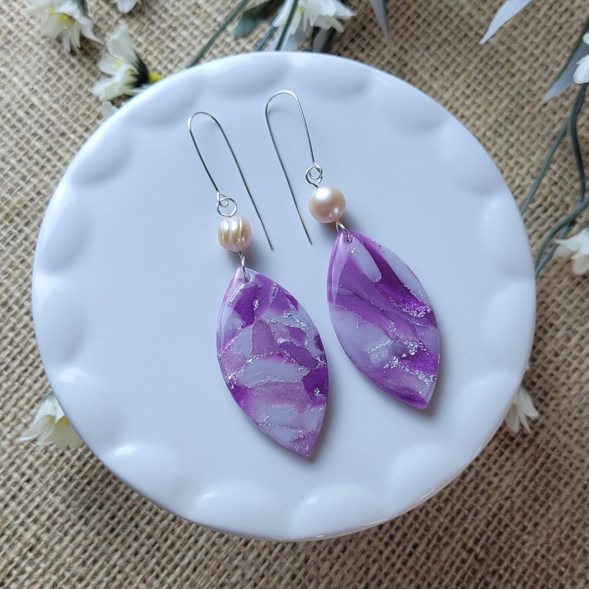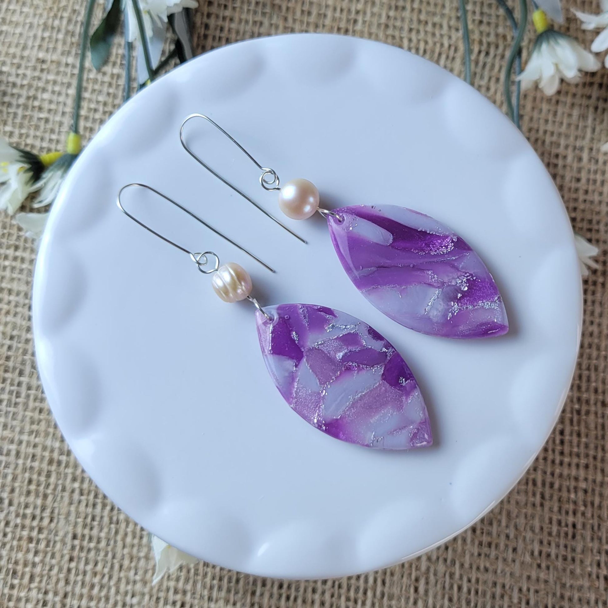 Refined, modern, and effortlessly elegant—these amethyst-inspired clay earrings bring a subtle pop of color to your everyday look. Handcrafted with soft purple tones and silver foil accents, each pair offers the essence of amethyst in a clean, lightweight form. Made from polymer clay and sealed with a high-gloss resin, these earrings are finished with sterling silver ear wires for comfort and simplicity. No fuss, just timeless design with a hint of natural inspiration.
