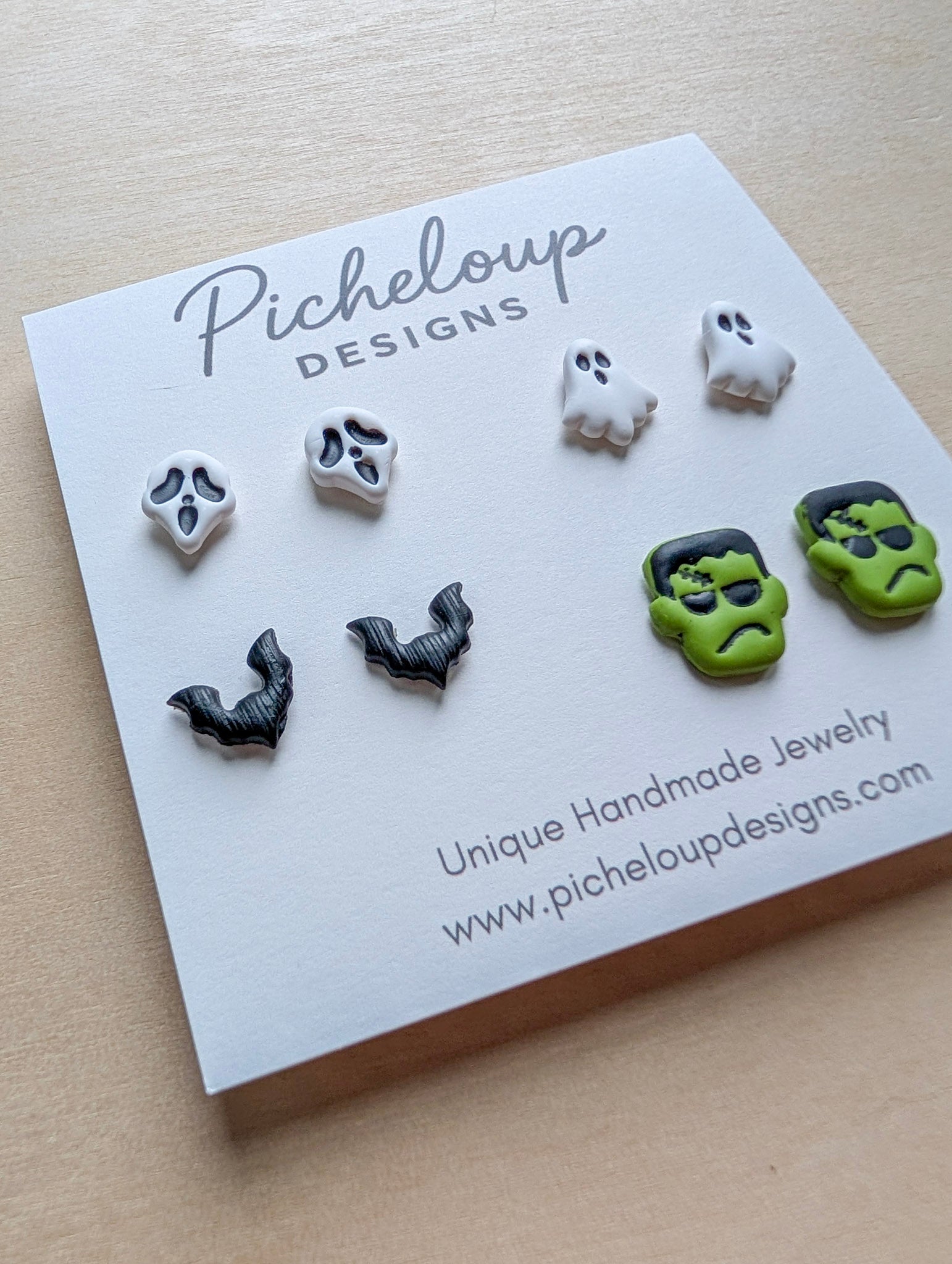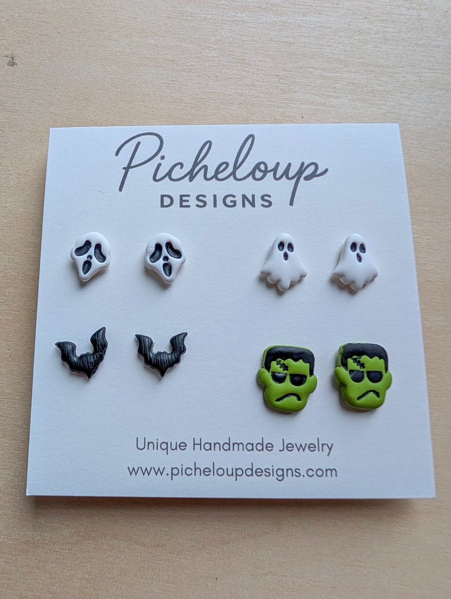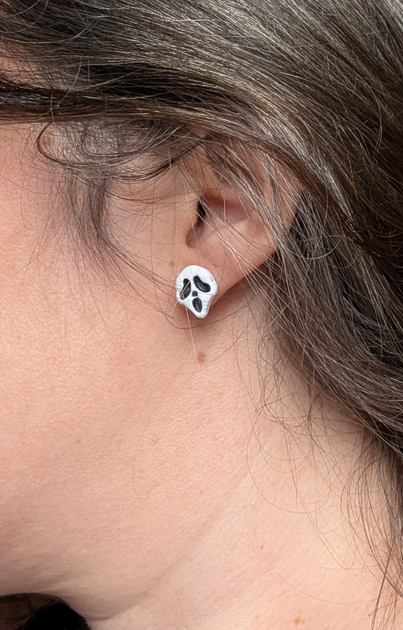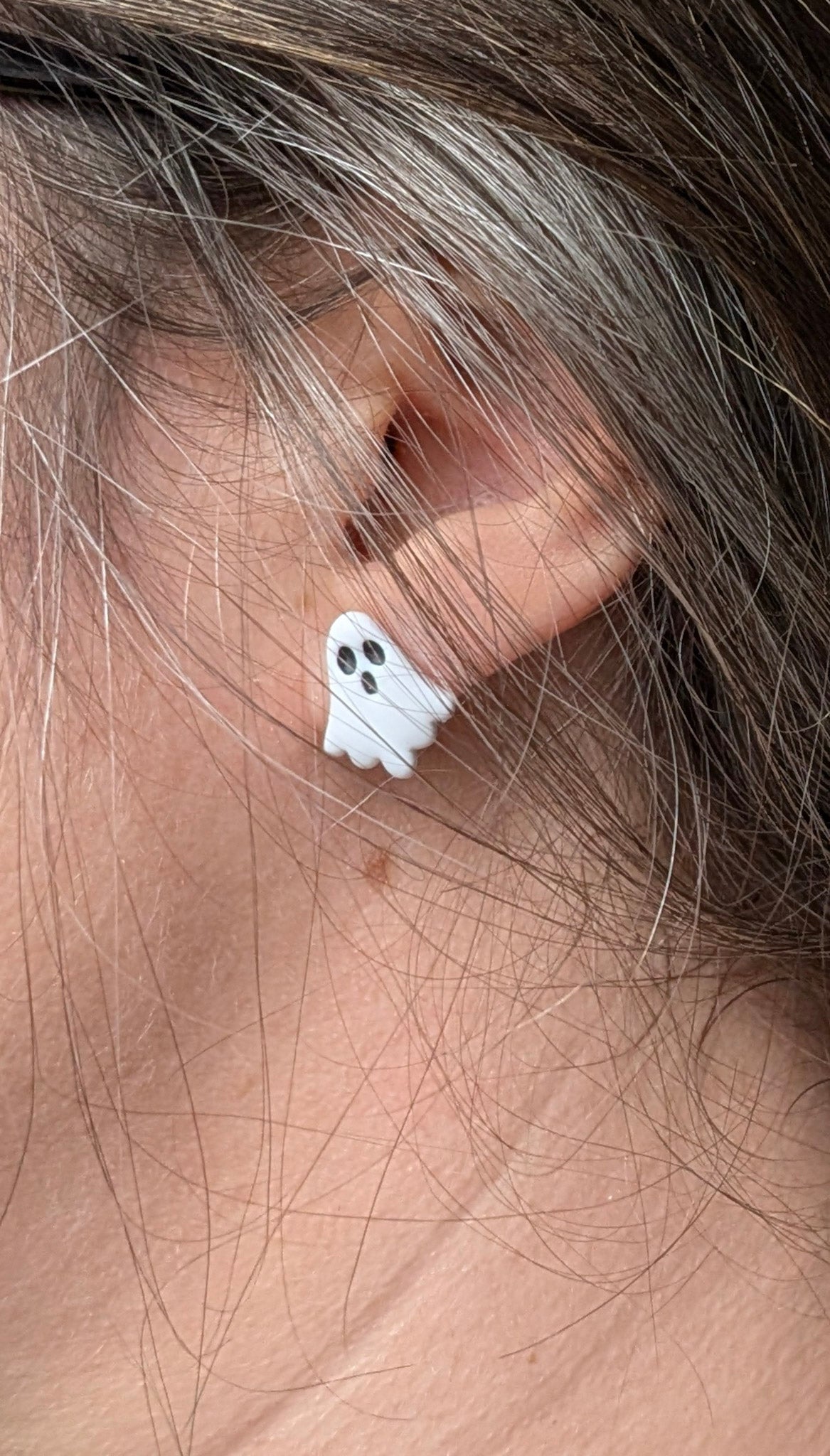Each stud is handmade from polymer clay, finished in a matte texture, and secured to hypoallergenic titanium posts for sensitive ears. Measuring just 0.5 inches, these tiny statement pieces are lightweight, mix-and-match friendly, and perfect for kids, teens, and adults who love Halloween’s playful side.