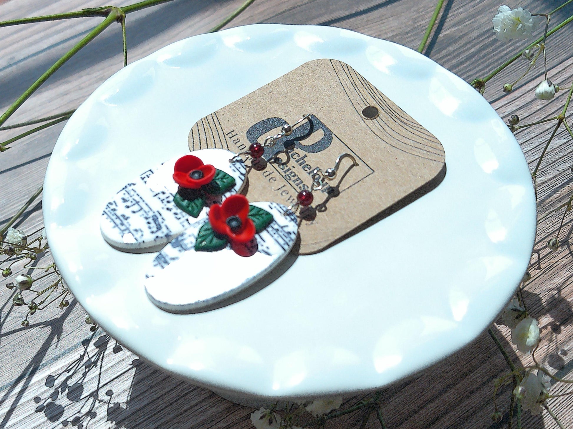 Where music meets wild bloom 🎶🌺 The Sonata Earrings are a lyrical blend of sound and style. Sculpted from lightweight polymer clay, these oval dangles feature a crisp white backdrop hand-detailed with flowing black music notes, vibrant red flowers with bold black centers, and green leaf accents. Shimmering droplets of silver alcohol ink and a single garnet bead complete the look—equal parts elegance and drama. Finished with sterling silver fishhooks and a soft matte surface, this style is perfect for performers, music lovers, and everyday romantics who like their accessories with a bit of soul. ✨