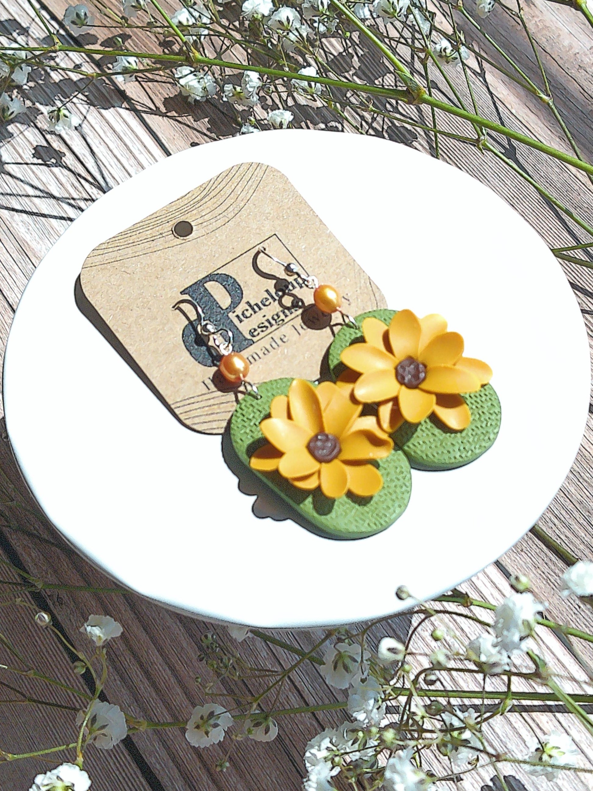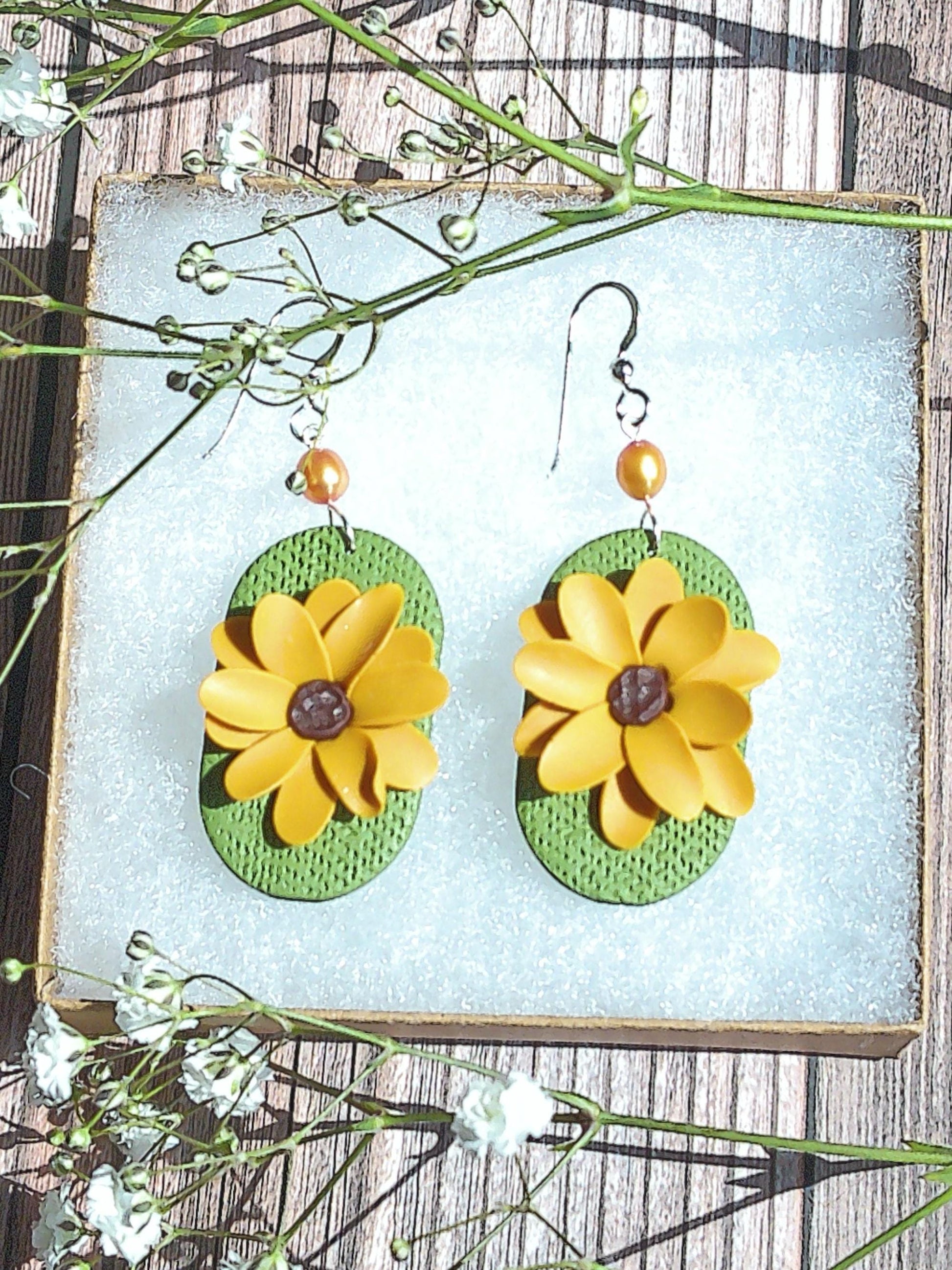 Introducing the Sun Meadow Earrings – a joyful burst of sunshine captured in polymer clay. These hand-sculpted sunflower dangles feature delicate yellow petals radiating from a textured center, set against a soft green linen-inspired background that feels like a walk through summer fields. Each pair is finished with a yellow freshwater pearl accent for a natural glow, and they sway gently from sterling silver fishhook earwires for a light, comfortable fit. Whether you're dancing at a summer festival or just adding sunshine to your everyday look, these earrings are made to bloom wherever you go. ✨