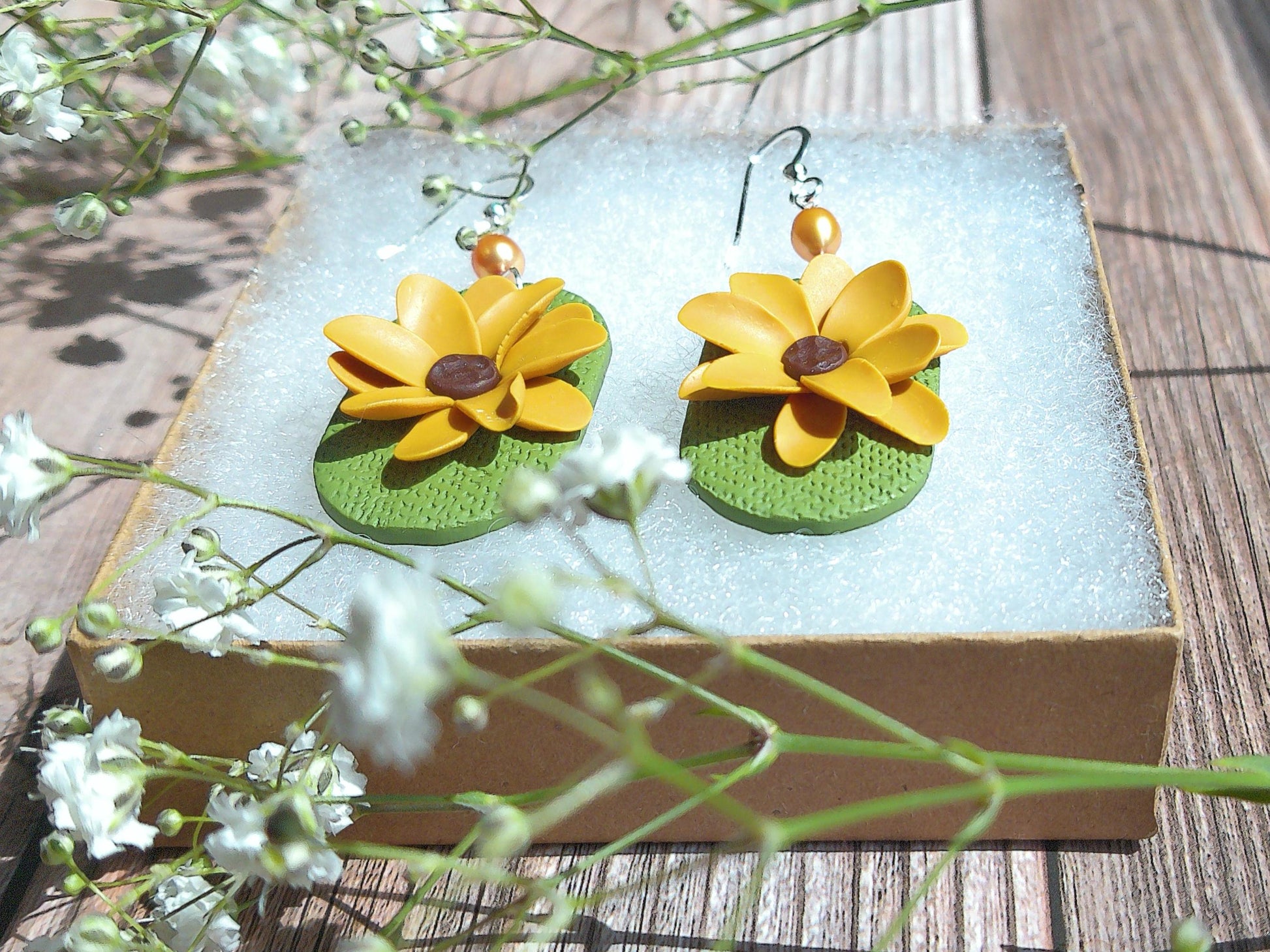 Sun Meadow Earrings – Sunflower Polymer Clay Dangles with Freshwater Pearl & Sterling Silver Hooks