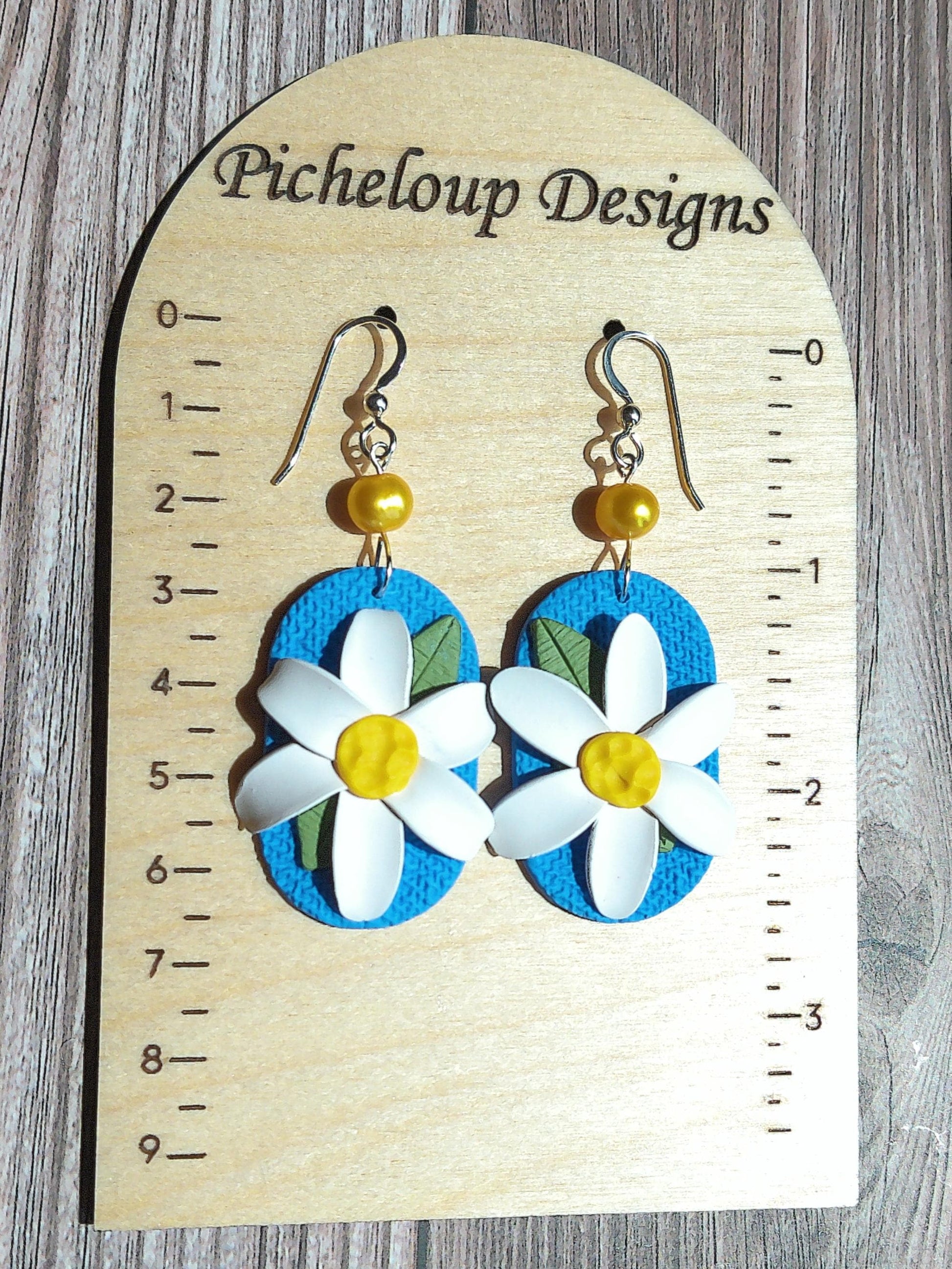 Meet the Wild Daisy Bloom Earrings — a playful nod to nature’s simplicity with a touch of boho charm. Handcrafted from lightweight polymer clay, these earrings feature a soft linen-textured blue backdrop, each one centered with a sculpted white daisy and a golden yellow heart. A small freshwater pearl dances just above the floral charm, suspended from sterling silver fishhook ear wires for comfortable, hypoallergenic wear. The oval shape flatters every face and offers just enough length to feel like a statement without the weight. ✨