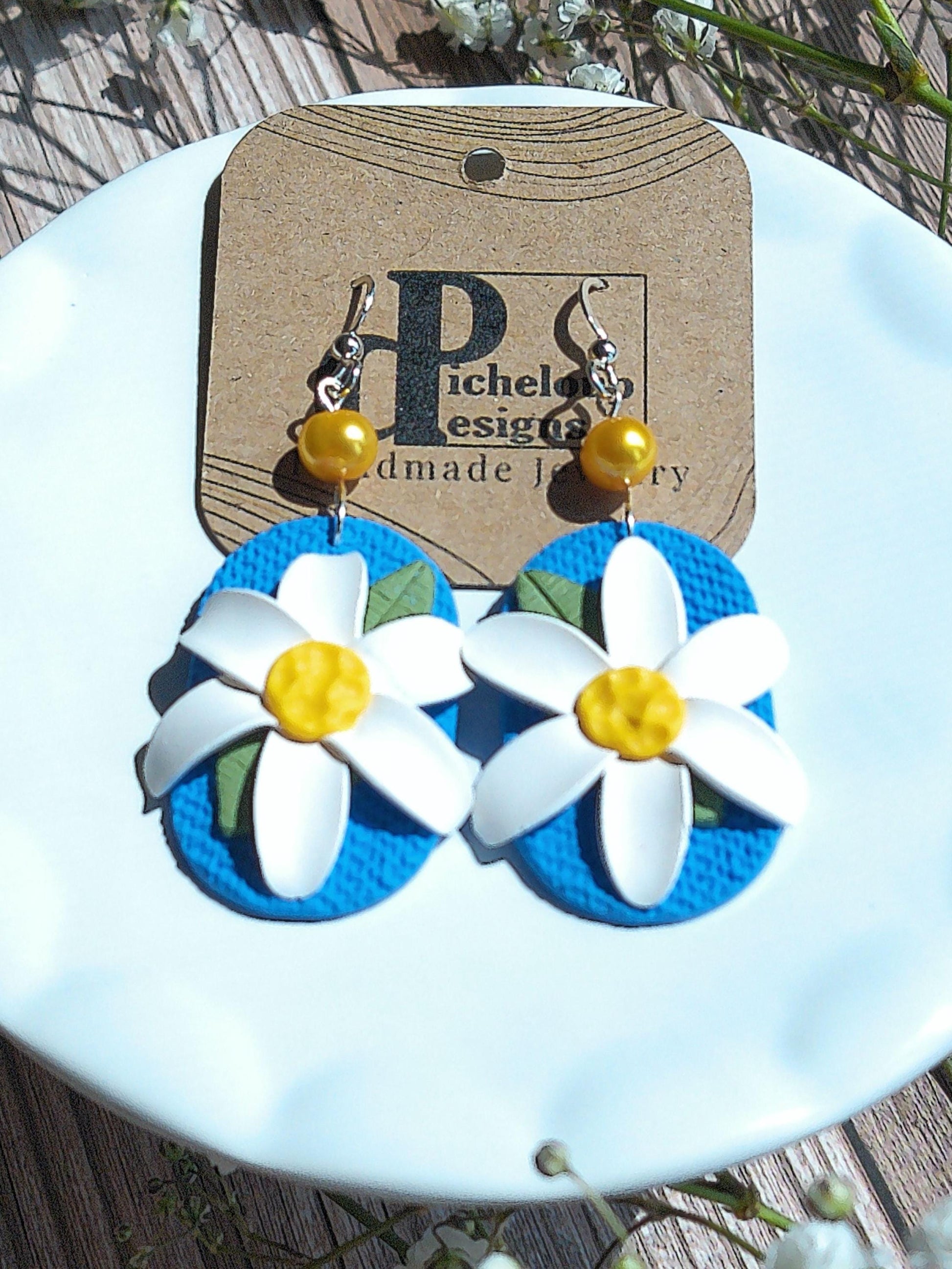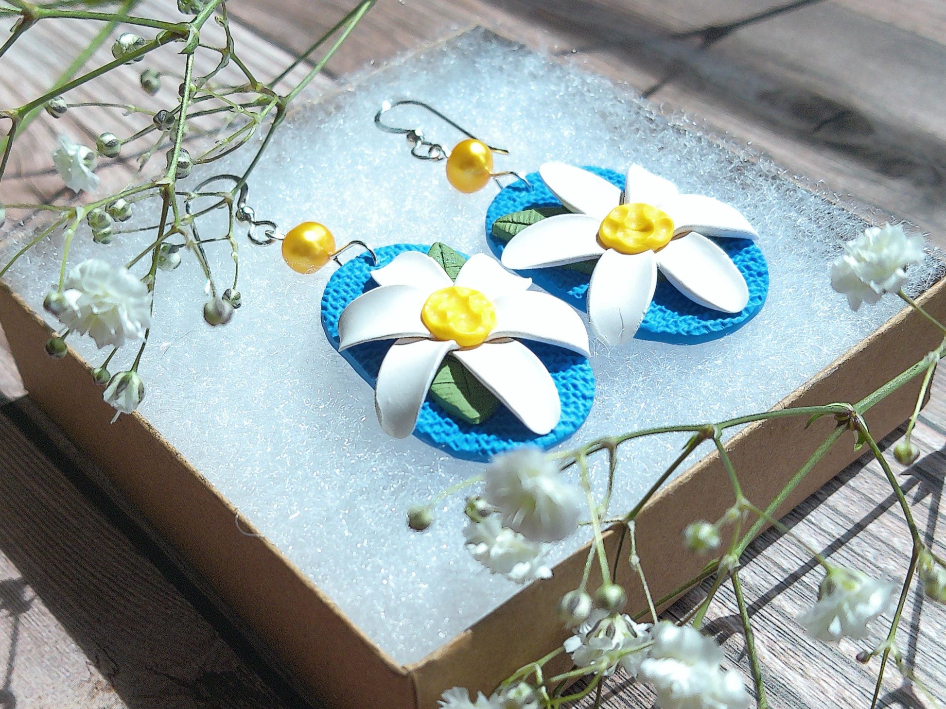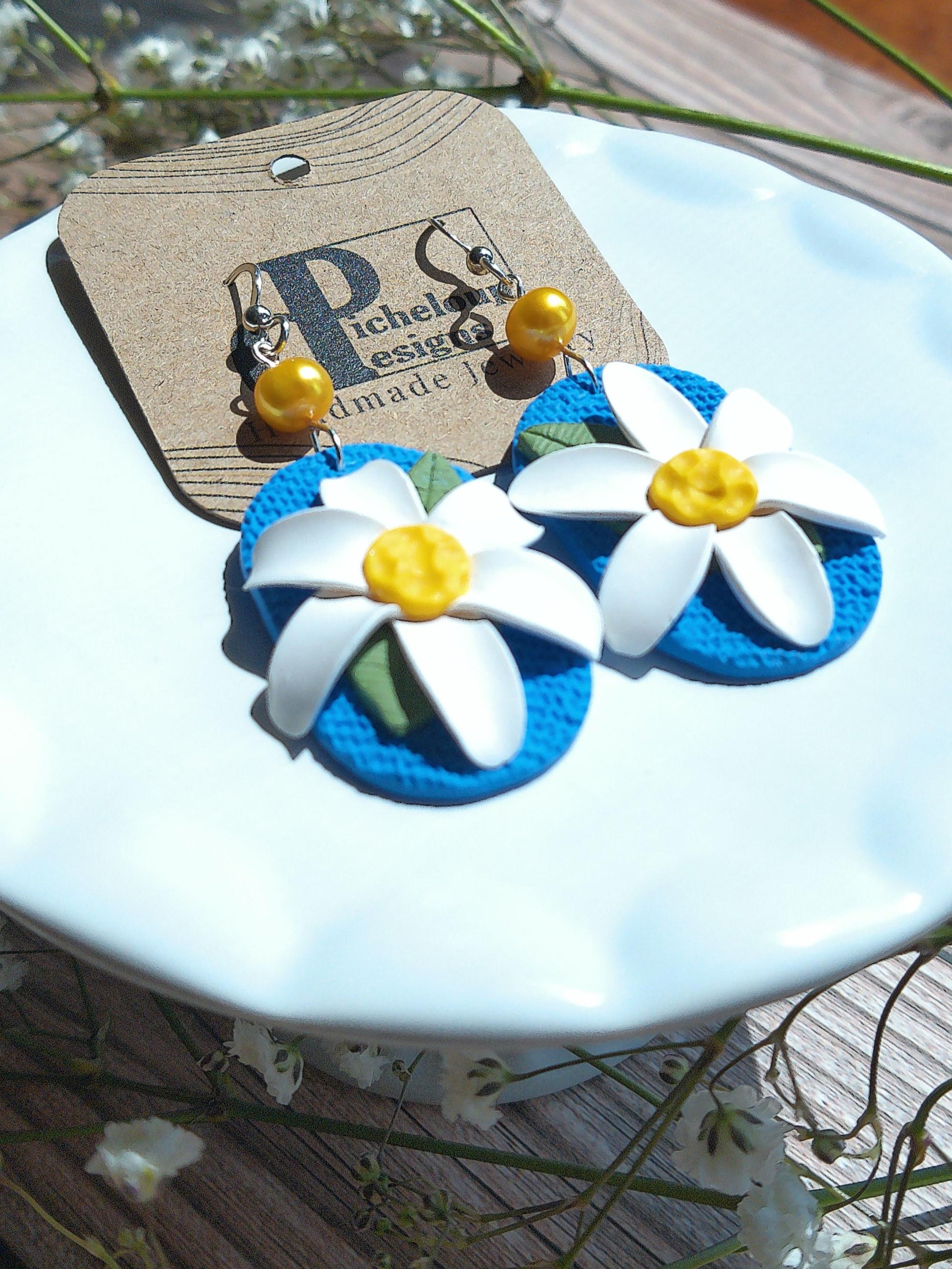 Wild Daisy Bloom Earrings – Blue Polymer Clay Floral Dangles with Freshwater Pearl & Sterling Silver Hooks