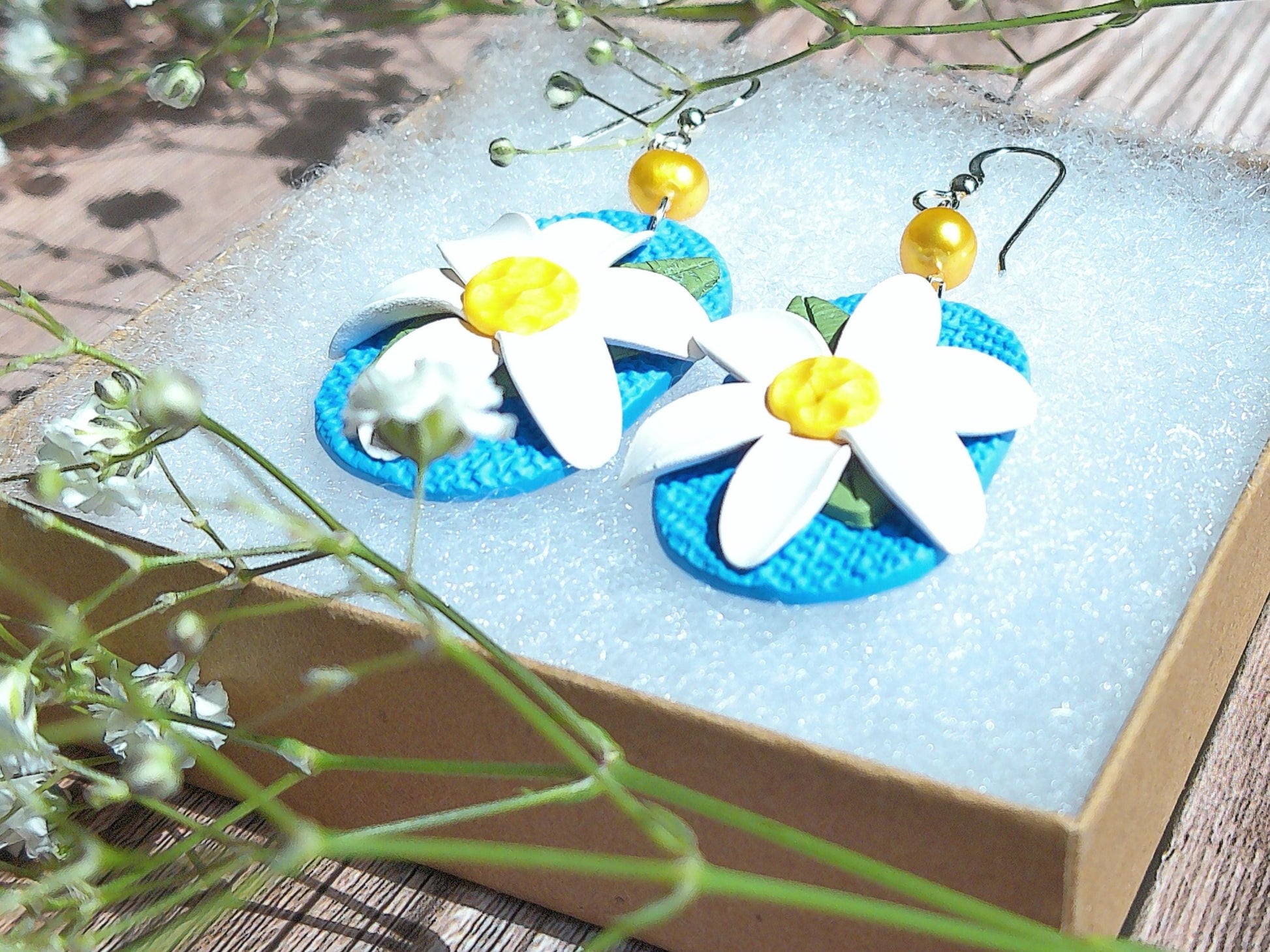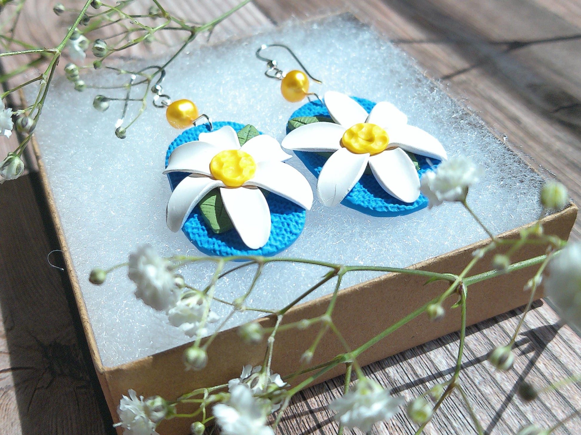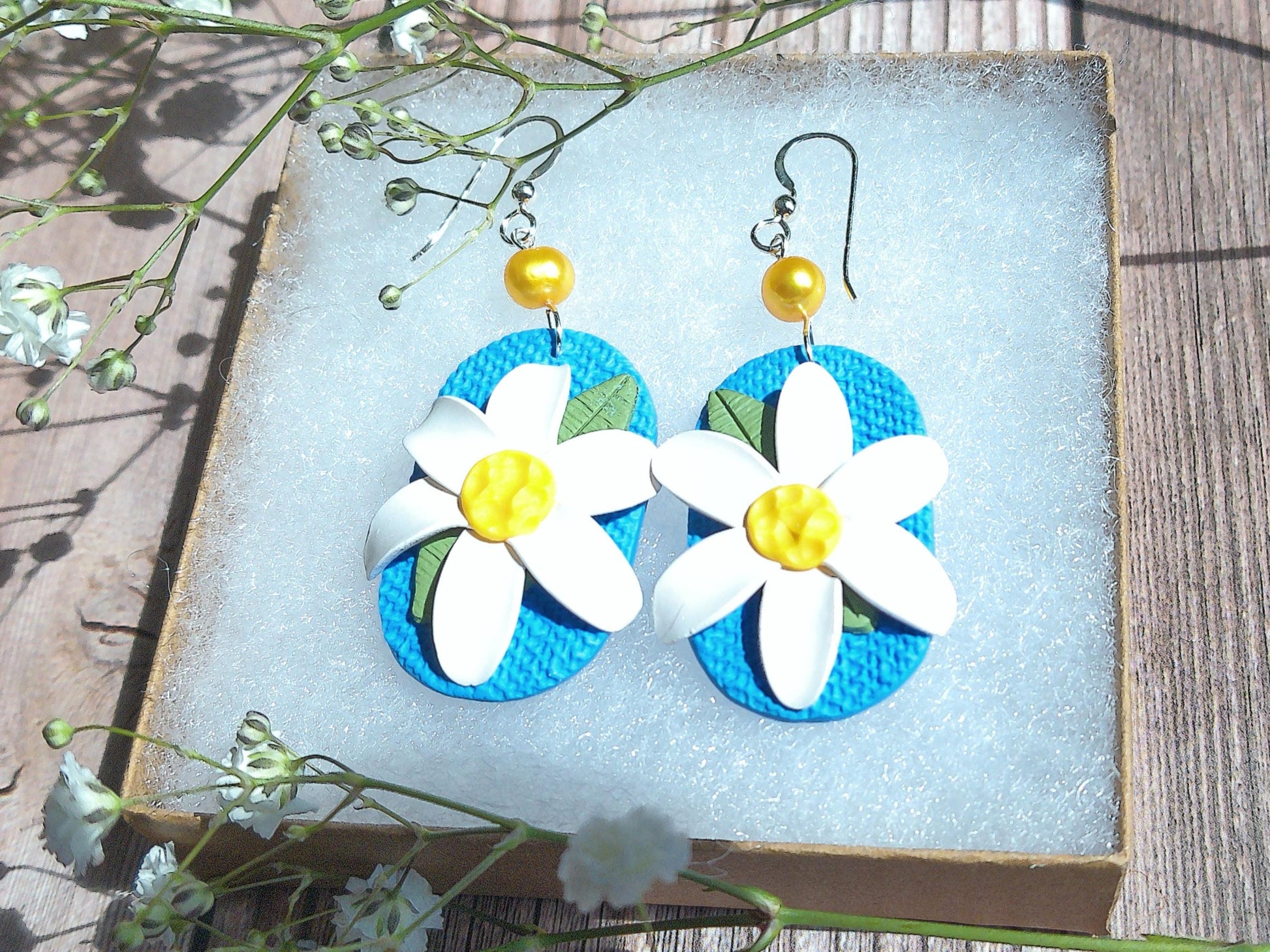 Wild Daisy Bloom Earrings – Blue Polymer Clay Floral Dangles with Freshwater Pearl & Sterling Silver Hooks